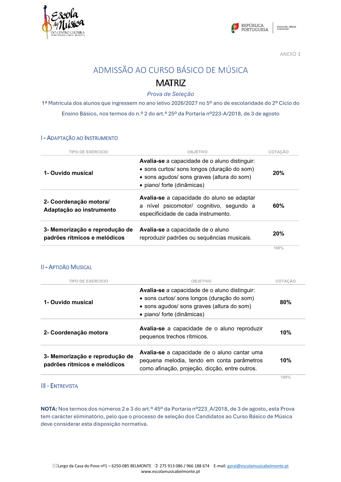 a. Adaptação ao instrumento – o objetivo desta prova é aferir a coordenação motora, bem como a adaptação específica ao instrumento, ouvido musical e capacidade de reprodução de padrões rítmicos/ melódicos, no domínio instrumental, não carecendo, por isso, de conhecimentos prévios, ao nível da execução.