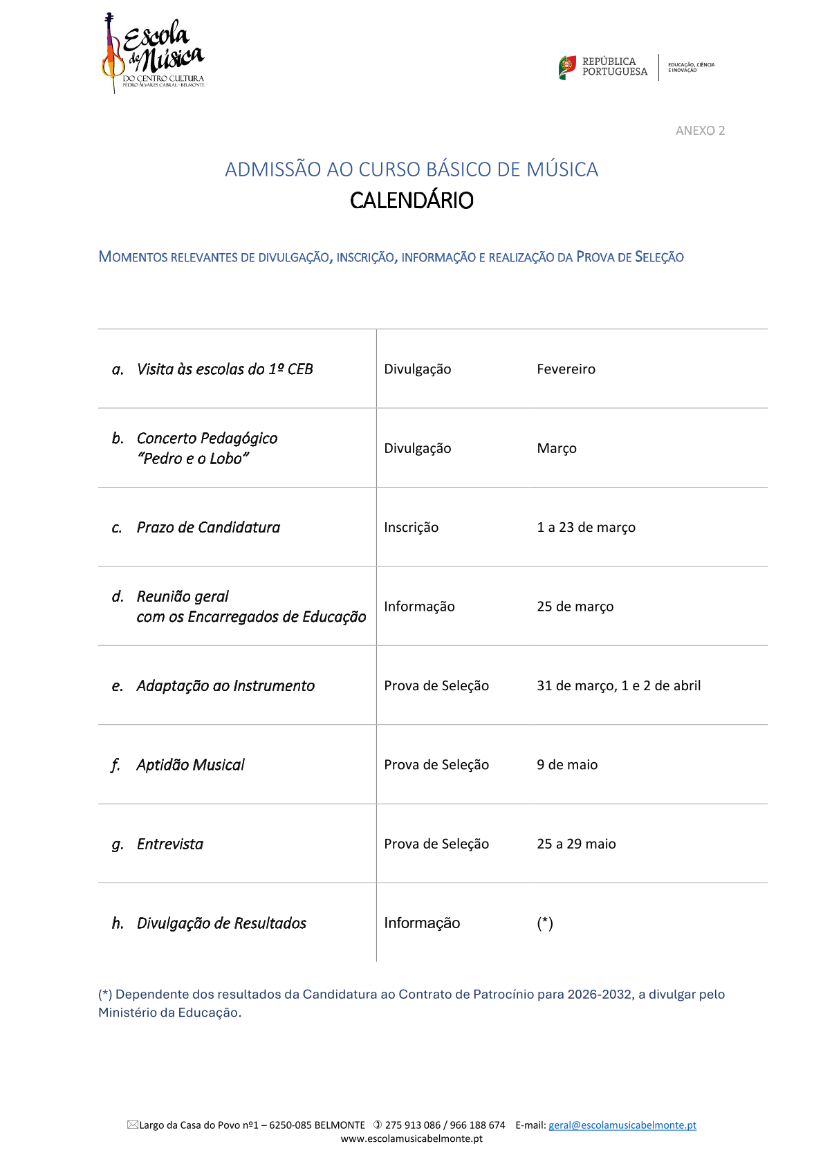 6. As candidaturas às Provas de Seleção decorrem entre os dias 1 e 23 de março de 2026, devendo ser submetidas através do formulário “Candidatura ao Curso Básico de Música”, disponível na página web da Escola: www.escolamusicabelmonte.pt